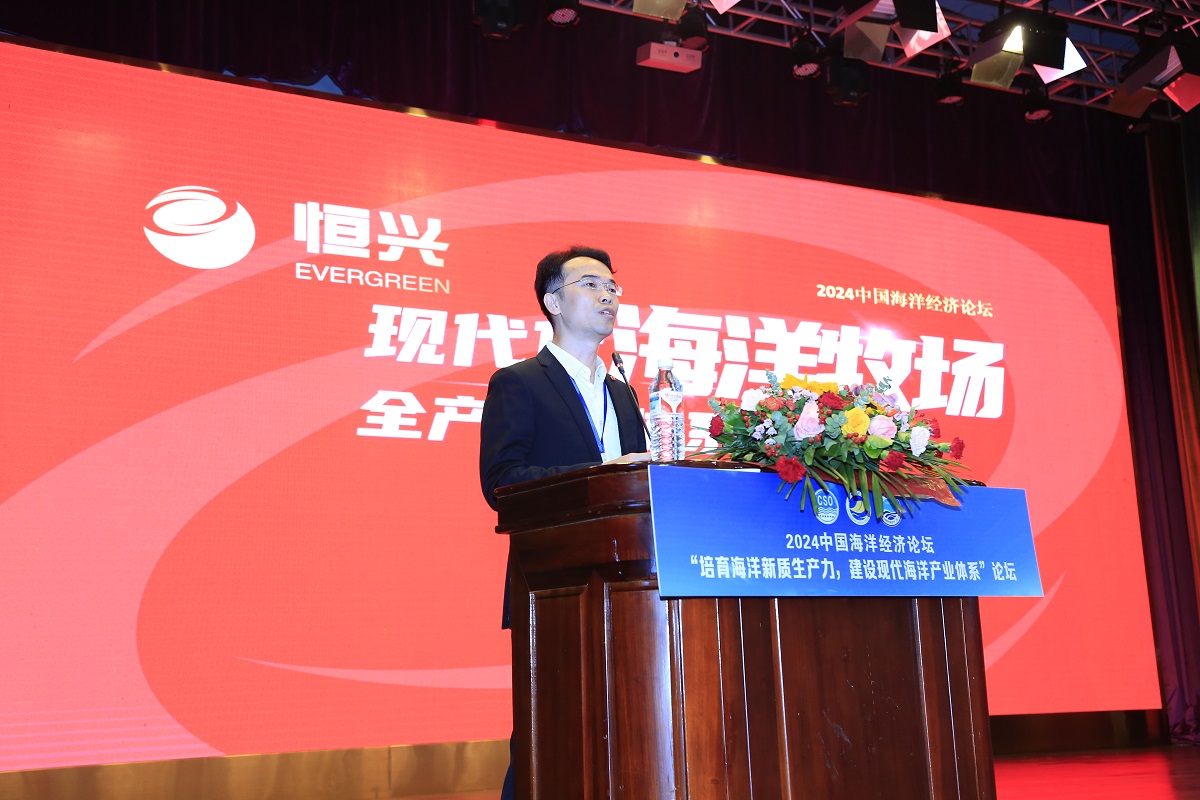會上,公司黨支部副書記、宣傳領導小組辦公室主任、高級工程師周劍熙博士受陳丹董事長委托,作為恒興集團代表在本次論壇上作主旨報告《恒興現代化海洋牧場全產業鏈體系建設》。